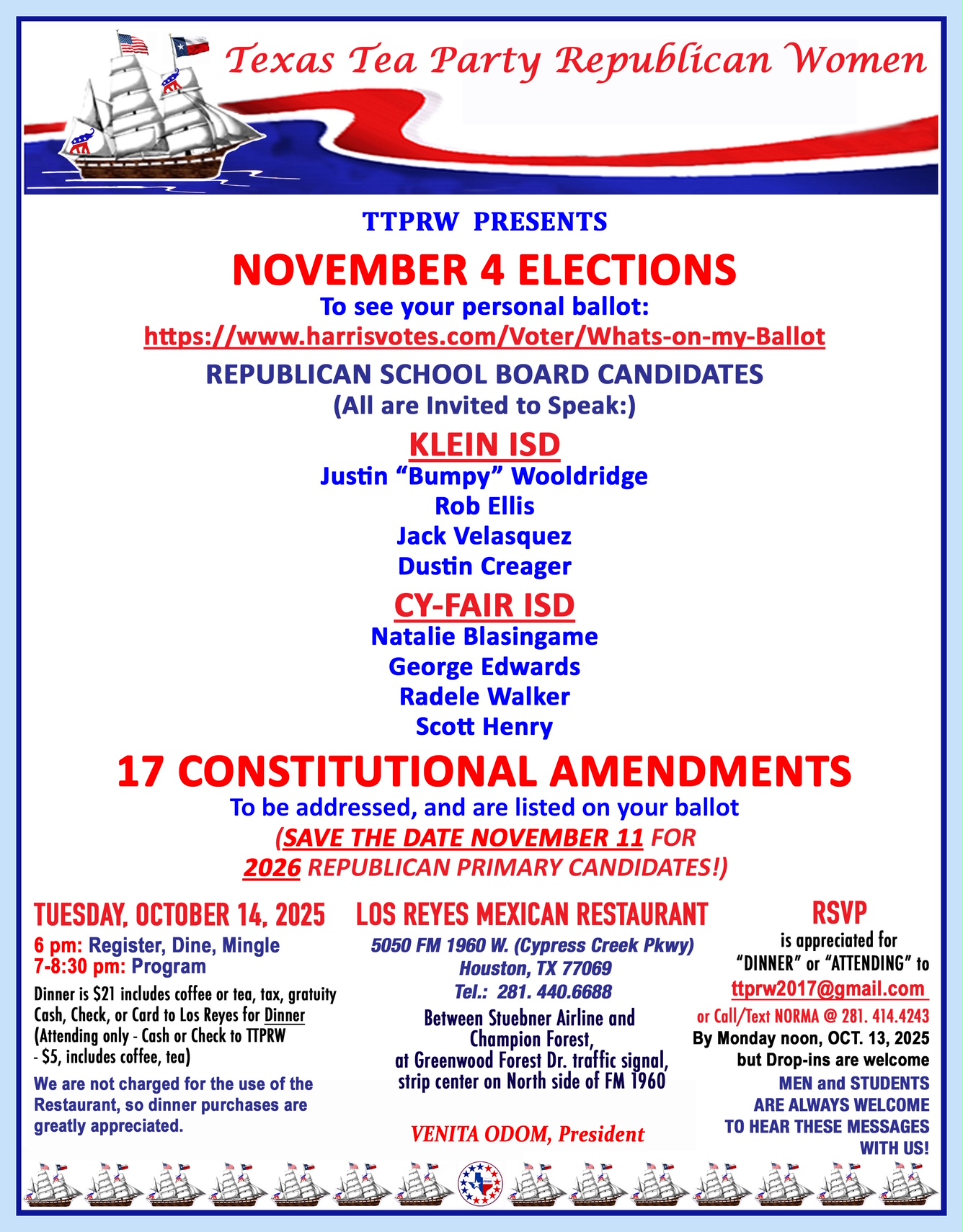 Please join Alexie Swirsky there to support our only Republican Harris County Commissioner, Tom Ramsey. Parking is available across the street for $15.